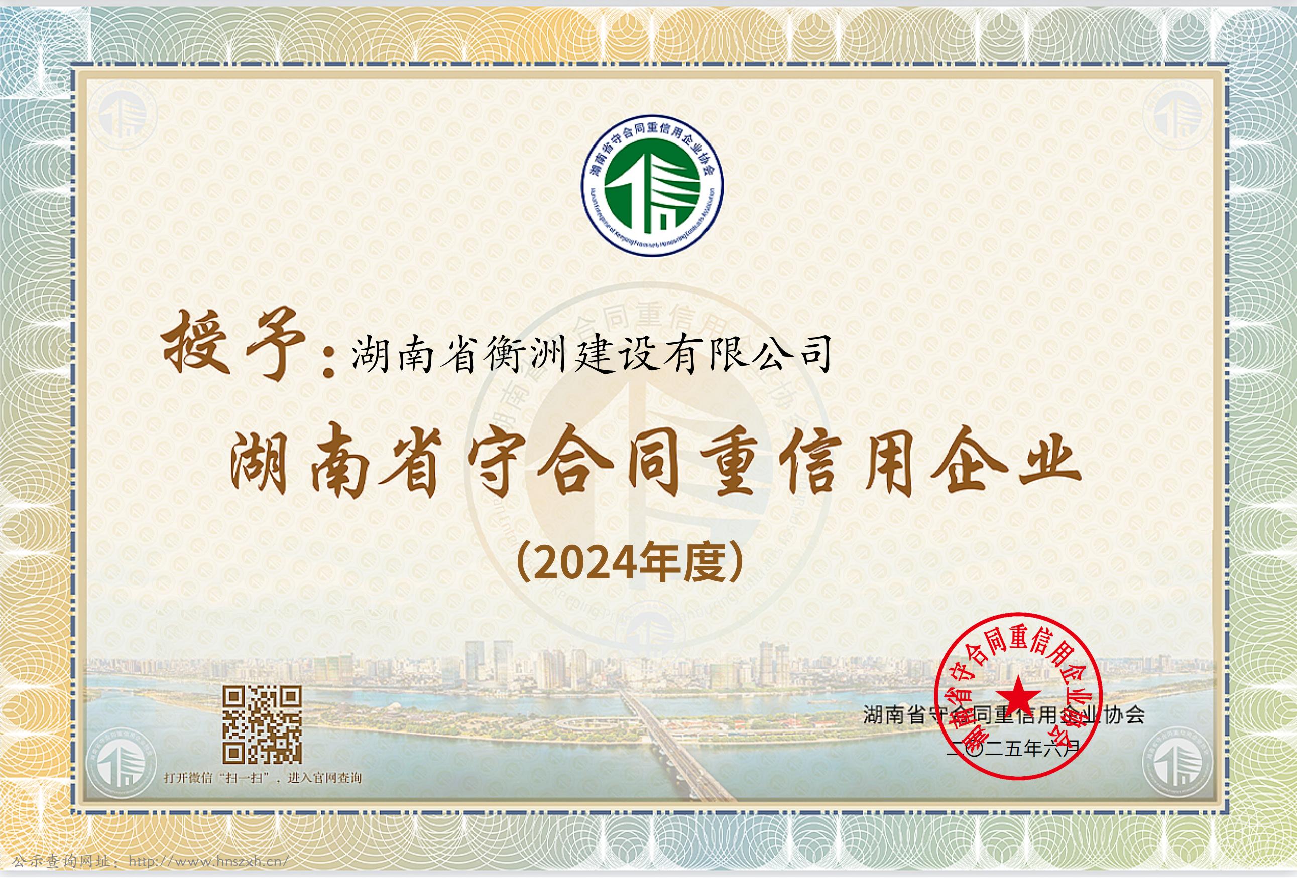 近日,湖南省守合同重信用協(xié)會正式公布 2024 年度 “湖南省守合同重信用企業(yè)” 名單,湖南省衡洲建設有限公司憑借卓越的信用管理水平與良好的市場信譽再度登榜。這是衡洲建設自1999年以來,第24次獲得湖南省“守合同重信用企業(yè)”殊榮。